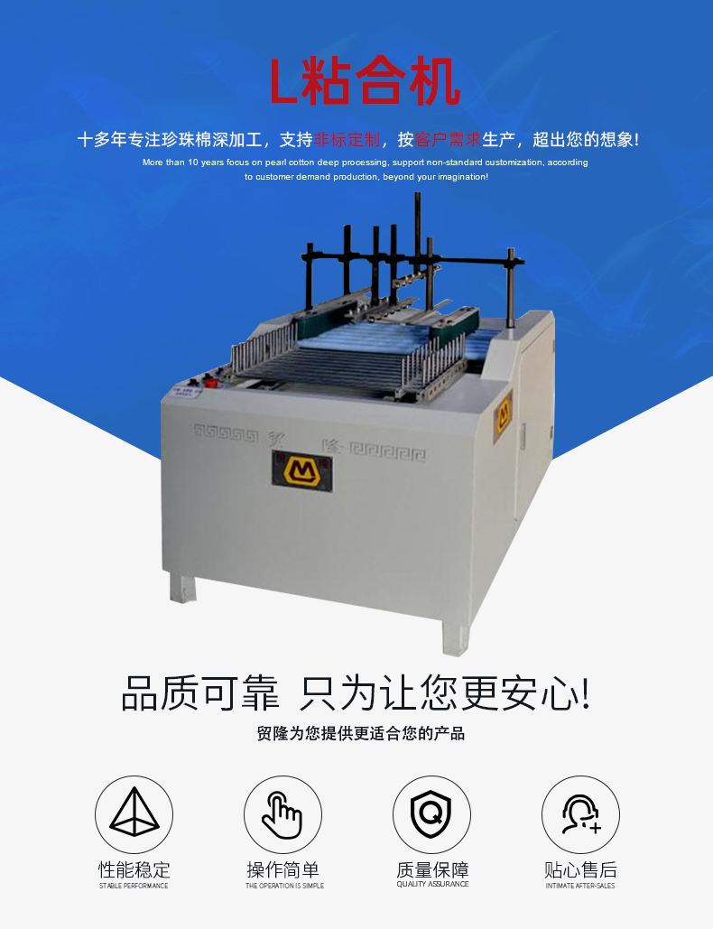 L粘合机 产品简介 突出优势 工作原理 技术参数 应用物料 在线留言 L粘合机 产品简介: 珍珠棉粘框机主要用于珍珠棉框的一次性热风粘合成型 应用范围:针对珍珠棉条的一次热风粘合成型 物 料:珍珠棉条 设备咨询 索取报价 突出优势 1.连续式贴合机效率高; 2.进料定位系统,容易边角对齐; 3.L型U型容易切换。 工作原理 连续式贴合机效率高; 2.进料定位系统,容易边角对齐; 3.L型U型容易切换。 技术参数 应用物料 珍珠棉加工 纸板切割 eva切割机材料 在线留言 * 您的称呼: *联系电话: 使用地区: 请选择 北京市 上海市 天津市 重庆市 河北省 山西省 内蒙古自治区 辽宁省 吉林省 黑龙江省 江苏省 浙江省 安徽省 福建省 江西省 山东省 河南省 湖北省 湖南省 广东省 广西壮族自治区 海南省 四川省 贵州省 云南省 西藏自治区 陕西省 甘肃省 宁夏回族自治区 青海省 新疆维吾尔族自治区 香港特别行政区 澳门特别行政区 台湾省 其它 市: 请选择 产品类别: 请选择 珍珠棉切割设备 珍珠棉粘合设备 珍珠棉开槽设备 涂胶设备 其它 产品型号: 请选择 电子邮箱: 简单描述: